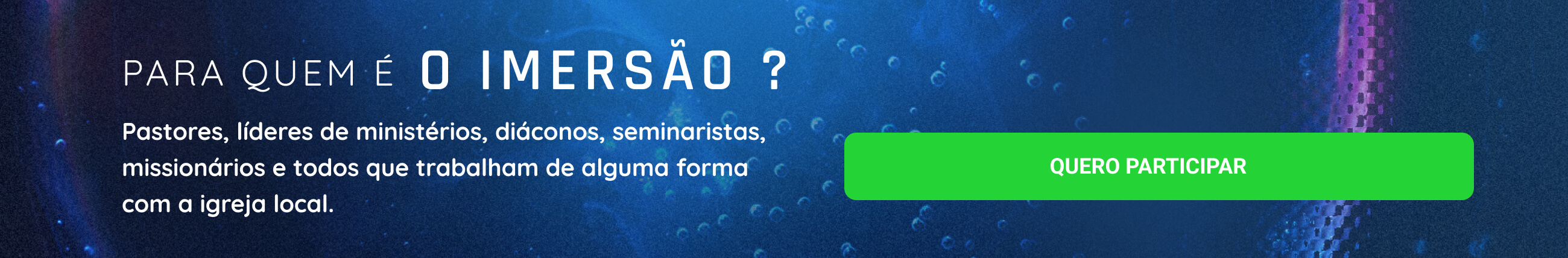 O Imersão Trindade é um treinamento promovido pela Igreja da Trindade para pastores, diáconos e líderes de igrejas interessados em conhecer e aprender mais sobre eclesiologia.